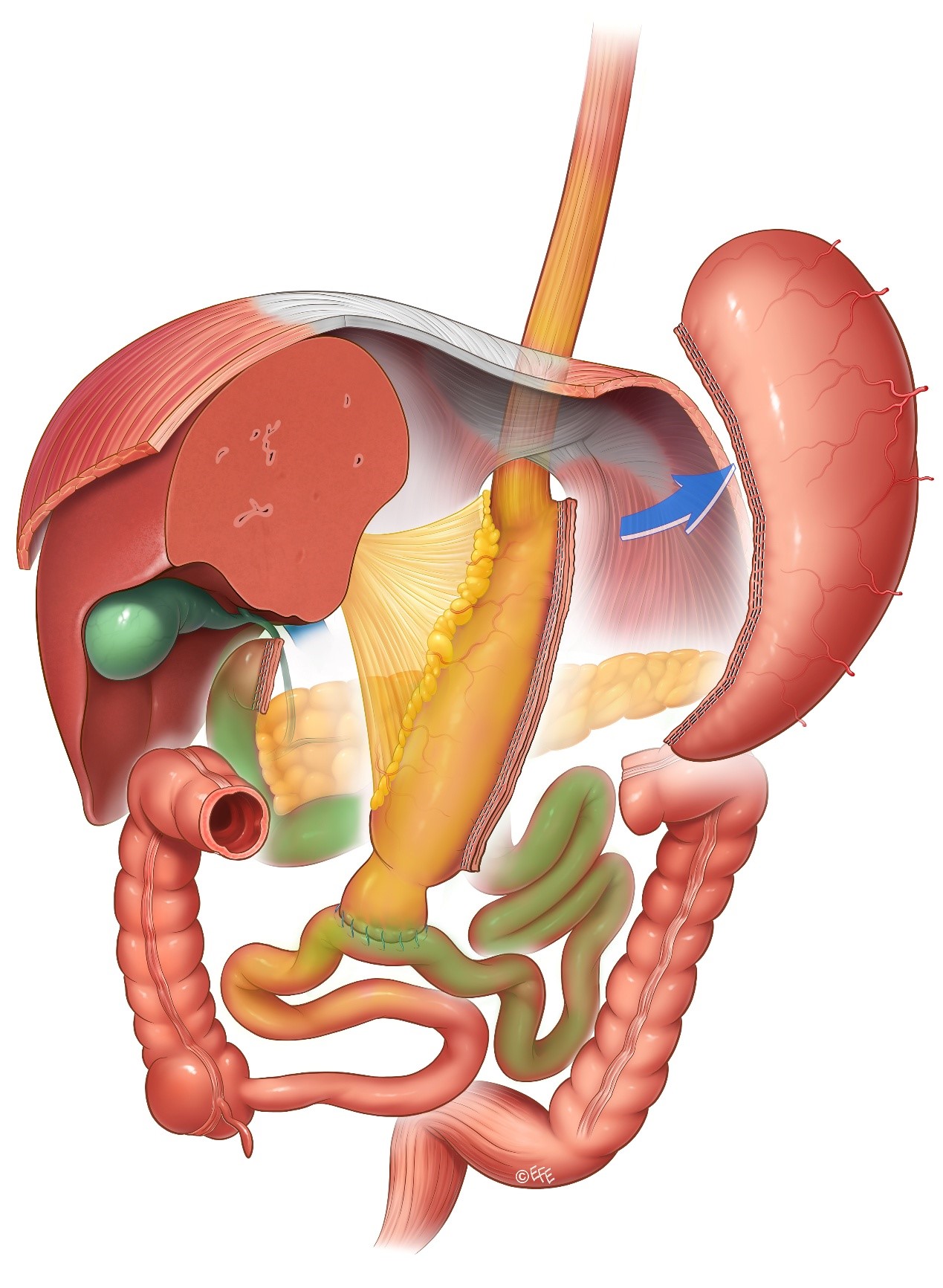 Το στομάχι μειώνεται και διαμορφώνεται σε στενό σωλήνα, περιορίζοντας σημαντικά την ποσότητα τροφής που μπορεί να καταναλωθεί (αφαιρείται περίπου το 80% του στομάχου).
